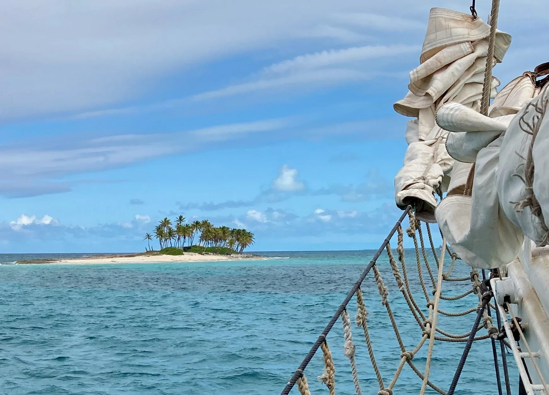 If those words and the first image below strike a memory cord, then you can understand my excitement stepping onto Gilligan’s Island for three hours of beach bumming. How tiny and close to civilization the island really is. Of course, this iconic image was only used for the sitcom’s opening scene and the show was filmed in a studio. After six weeks this winter at an intensive yoga retreat, I wanted to spend some time on water before leaving The Bahamas. Enter the 125 ft. Liberty Clipper of Boston, a tall ship that makes Nassau its summer home for island-hopping windjammer cruises. I went from asanas, meditation and yoga philosophy classes to a week of hoisting sails alongside the crew and exploring the Out Islands of The Bahamas with amazing unobstructed sunsets over the water.